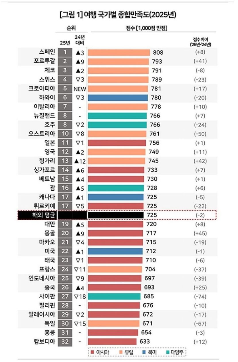 여행 만족도 순위, 1위 스페인, 2위 포르투칼. 불만족 국가는 어디 어디? 여행 국가별 만족도. 스페인 1위 그리고 그 다음은? 2025년 여행 국가별 종합만족도. 1위 스페인 2위 포르투칼 3위 체코 4위 스위스 5위 크로아티아로 1위부터 5위까지는 유럽국가이고, 6위는 하와이. 기본적으로 대부분 생각하는 국가이기는 한데 공유하기 게시글 관리 킁킁닷넷 에임 종이컵 제작 인쇄 전자담배액상 비트코인 가시눈뉴스 애니리뷰 & 게임공략략 SEO최적화 벤츠튜닝 Related Articles 4대성인 교리 핵심 한줄 요약 아프리카 인방, 딱걸려서 실형 8개월 받은 남자 혹등고래 크기 체험, 선착장 온 혹등고래 컴포즈 여사장, 아저씨 때문에 눈물 흘린 이유