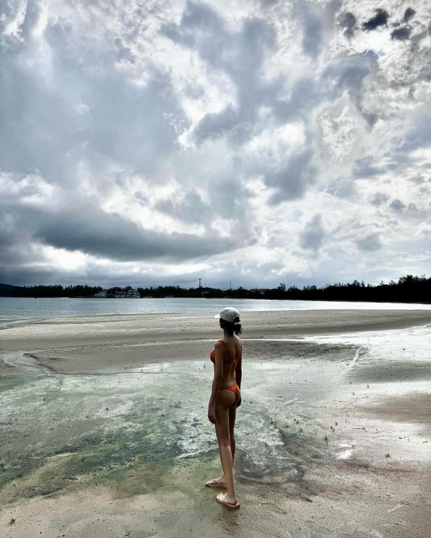 특히 끈으로 된 비키니 하의가 골반 라인을 더욱 돋보이게 만들어, 슬림하면서도 굴곡진 S라인 몸매를 가감 없이 보여주고 있습니다.