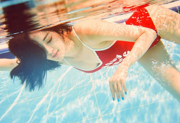 길게 뻗은 팔다리와 작은 얼굴이 비율 천재임을 증명하는 것 같습니다. 귀여운 수영복 디자인이지만 숨길 수 없는 볼륨감이 돋보여 '큐티 섹시'의 정석을 보여주고 있네요.