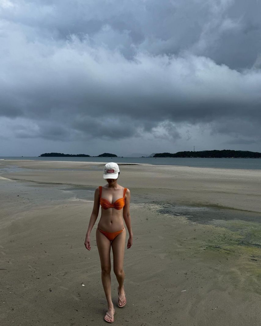 채도가 높은 오렌지 컬러의 비키니를 착용해 구릿빛 피부와 완벽한 조화를 이루고 있는데요. 여기에 'Supreme' 로고가 박힌 화이트 볼캡을 푹 눌러써 힙하면서도 시크한 분위기를 연출했습니다. 군살이라곤 찾아볼 수 없는 탄탄한 복근과 직각 어깨 라인이 정말 예술이네요.