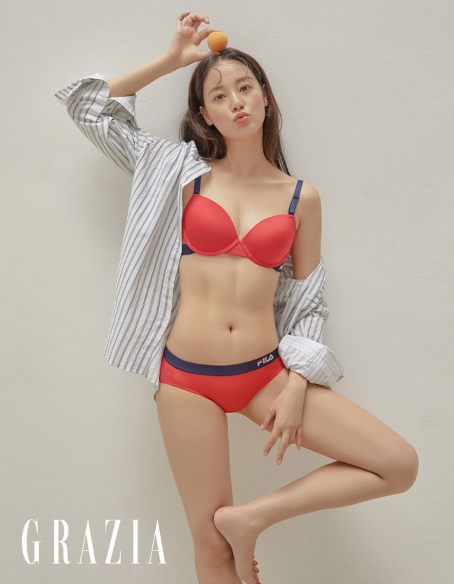 블랙 컬러의 홀터넥 상의와 보라색 프릴 디테일이 들어간 하의를 믹스 매치했습니다. 상체를 숙인 포즈에서도 굴욕 없는 라인과 깊은 쇄골이 시선을 강탈하네요. 마냥 마른 줄만 알았는데, 나올 데 나오고 들어갈 데 들어간 워너비 몸매 그 자체입니다.