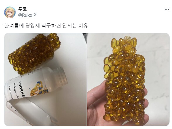 최근 트위터(X) 등 커뮤니티에서 화제가 되고 있는 사진입니다. 한 유저분이 여름철에 영양제를 해외 직구로 구매했다가 겪은 대참사 현장인데요. 사진을 한번 자세히 살펴볼까요?