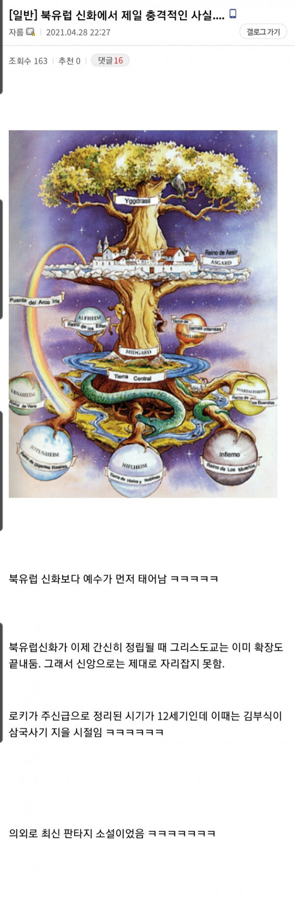 북유럽신화는 사실 판타지 소설 북유럽신화가 신화보다 판타지 소설에 가까운 이유 신화라고 하니까 북유럽신화가 되게 오래된 것 같지만 사실 북유럽신화의 역사는 짧은 어떻게 보면 최초의 판타지소설이라고 해도 될 정도.. 왜냐면 북유럽신화가 간신히 정립될 때, 기독교는 확장도 된 상태고. 로키가 주신급이 된 시기가 12세기인데. 이때는 김부식이 삼국사기 짓던 시기. 그러니까 통일신라 시대도 끝나고 고려때에 나온게 북유럽신화인거... 공유하기 게시글 관리 킁킁닷넷 종이컵 제작 인쇄 전자담배액상 가시눈뉴스 애니리뷰 & 게임공략략 SEO최적화 벤츠튜닝 Related Articles 남자성형 레전드. 남자성형 이러면 나도... 코로나백신과 안전벨트가 비슷하다고? 을지문덕 미스테리. 을지문덕에 대해 아는게 없다? 허경영 홍보대사 된 윤석열 후보 ?
