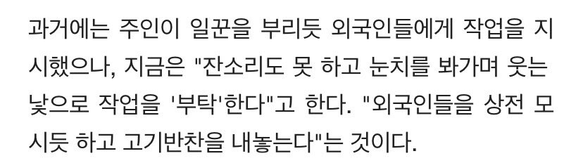 심지어 이유가 주인이 일꾼 부리듯 일 못 시키는 거라는 건 저건.. 진짜.. 뭐라고 말을 못 하겠네... 심지어 외국인들을 찌는 여름이나 추운 겨울에도 그냥 비닐하우스에서 잠자게 해서 생명을 잃는 적도 있는데. 참..
