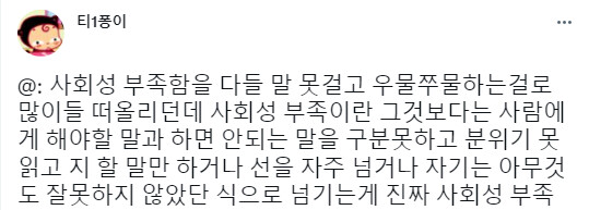 사회성부족은 말을 못 하는게 아닙니다 진짜 사회성부족의 의미 이 말 진짜 인정. 사회성부족하다는게 우물쭈물 말 한다거나 말을 잘 못 건다거나로 한정하면 안됨. 오히려 그건 사회성부족에서 크게 차지하지는 않음 어쨌거나 시간이 지나면 말도 걸 수 있고, 관계도 좋은 경우 많음. 낯가린다고 사회성부족인건 아님 오히려 사회성부족은 저 말대로, 자기만 알고 자기에만 관심가지는 사람이 더 맞다고 봄 공유하기 게시글 관리 킁킁닷넷 에임 종이컵 제작 인쇄 전자담배액상 비트코인 가시눈뉴스 애니리뷰 & 게임공략략 SEO최적화 벤츠튜닝 Related Articles 외국인 여자가 말하는, 만나면 안되는 여자 히키코모리 아들, 부모 때문이라는걸 느끼게 하는.. 호주인기 햄도그. 전문가는 비웃었지만 성공! 춘리 코스프레 압도적 재현