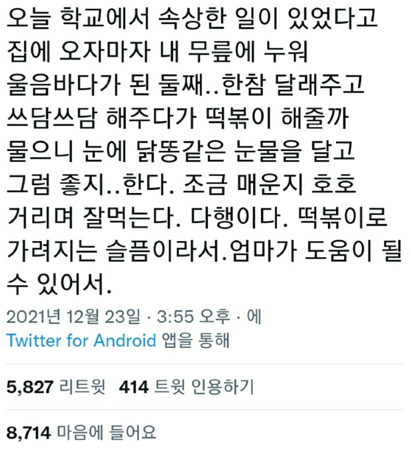 떡볶이로 가려지는 슬픔이라, 엄마가 도움이 될 수 있어서.. 떡볶이 해주는 어머니, 왠지 뭉클 둘째가 집에 오자마자 울어서, 떡볶기를 해주는 어머니 떡볶이로 가려지는 슬픔이라 다행이라는 말도 엄마가 도움이 될 수 있어서 라는 말도.. 왜 이리 뭉클하냐... ㅜㅠ 공유하기 게시글 관리 킁킁닷넷 종이컵 제작 인쇄 전자담배액상 가시눈뉴스 애니리뷰 & 게임공략략 SEO최적화 벤츠튜닝 Related Articles 블리자드코리아 직원은 왜 인수를 안 알려줬나? 엘지모니터 사지 말라는 이유, 좋은데 왜 엘지모니터 사지마? 면제 가능, 국가유공자 집안 헬스유튜버. 군대 간 이유 농부가 말하는 연애 못 하는 이유
