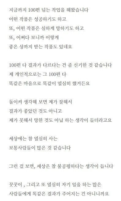 감동적인 오정세 수상소감 오정세 수상소감, 백상 남우조연상 수상한 오정세 지금 봐도 백상예술대상 오정세 남우조연상 수상소감은 감동적이다. 자전적인 내용이기도 하고, 일종의 인간찬가라고도 볼 수 있는 내용이라. 모두 어렵지만, 힘을 내봅시다! 공유하기 게시글 관리 킁킁닷넷 종이컵 제작 인쇄 전자담배액상 가시눈뉴스 애니리뷰 & 게임공략략 SEO최적화 벤츠튜닝 Related Articles 곰표 새 콜라보, 곰표 주방 용품들 카페에서 시끄럽다고 와이파이 바꾼 공시생 정창욱 셰프 (금산제면소) 폭력 피해자 폭로 일본 시골 고등학교, 중국에 점렴?? 한국은?