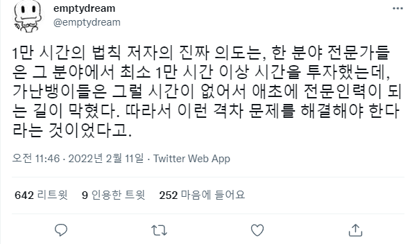 1만 시간의 법칙. 진짜 의도와 1만시각의 법칙 오해 1만시간의법칙 잘못 알고 있는 정보 흔히 1만시간의 법칙을 1만시간만 하면 뭐든지 전문가가 되는 그런거라고 생각하는 경우가 많은데 1만 시간의 법칙은 그런게 아님 10만 시간을 공부를 해도 안되는 사람은 안됨 재능을 가진 전문가들이 최소 1만 시간 이상을 투자했다는 거고, 돈이 없으면 능력이 있어도 그 시간 투자를 못 해서 전문인력이 되지 못 한다는 의미.... 공유하기 게시글 관리 킁킁닷넷 에임 종이컵 제작 인쇄 전자담배액상 비트코인 가시눈뉴스 애니리뷰 & 게임공략략 SEO최적화 벤츠튜닝 Related Articles 하루 1시간 6년 운동, 마른몸에서 몸짱이 된 남자 독일언론 한국이 2021년의 승리자 포커 족보, 포커 규칙 쉽게 이해하기 50KG 다이어트 성공한 여성 몸매 비교