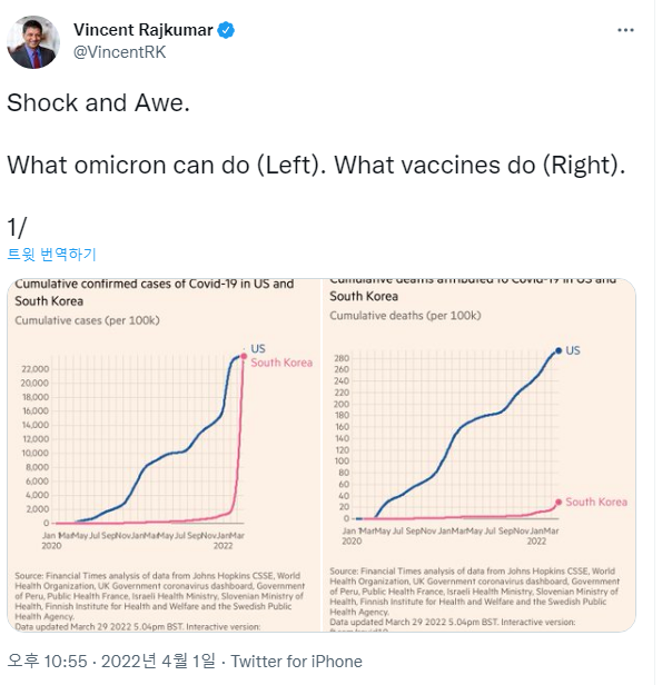 오른쪽은 코로나 사망자 수 미국과 한국의 비교