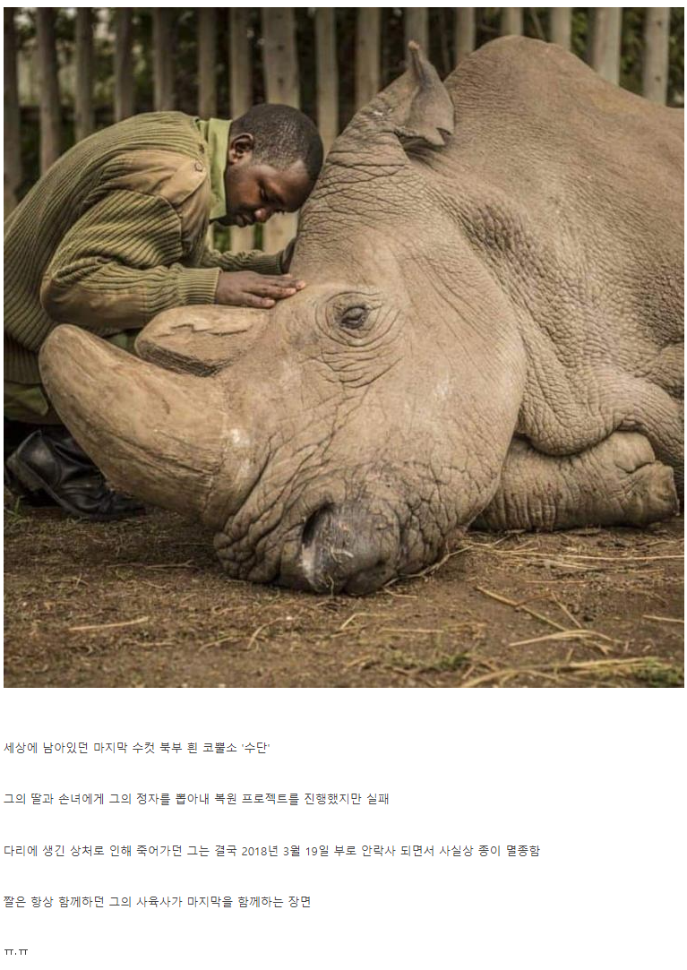 종이 멸종하는 순간. 마지막 흰 코뿔소의 마지막 세상 마지막 흰 꼬뿔소 수단이 숨을 거두는 순간 하나의 종이 멸종하는 순간의 사진 참 씁쓸하다... 그렇게 오래동안 살아오던 종이 보살핌 속에서도 끝을 맞이해야 하다니 언젠가 인간도 멸종을 맞을 날이 올까.. 온다면 무슨 이유일까 공유하기 게시글 관리 킁킁닷넷 에임 종이컵 제작 인쇄 전자담배액상 비트코인 가시눈뉴스 애니리뷰 & 게임공략략 SEO최적화 벤츠튜닝 Related Articles 하품하는 토끼 움짤 다람쥐 가족의 낮잠. 심장주의! 수박 안에 강아지 움짤 고양이로 보는 새해 작심3일