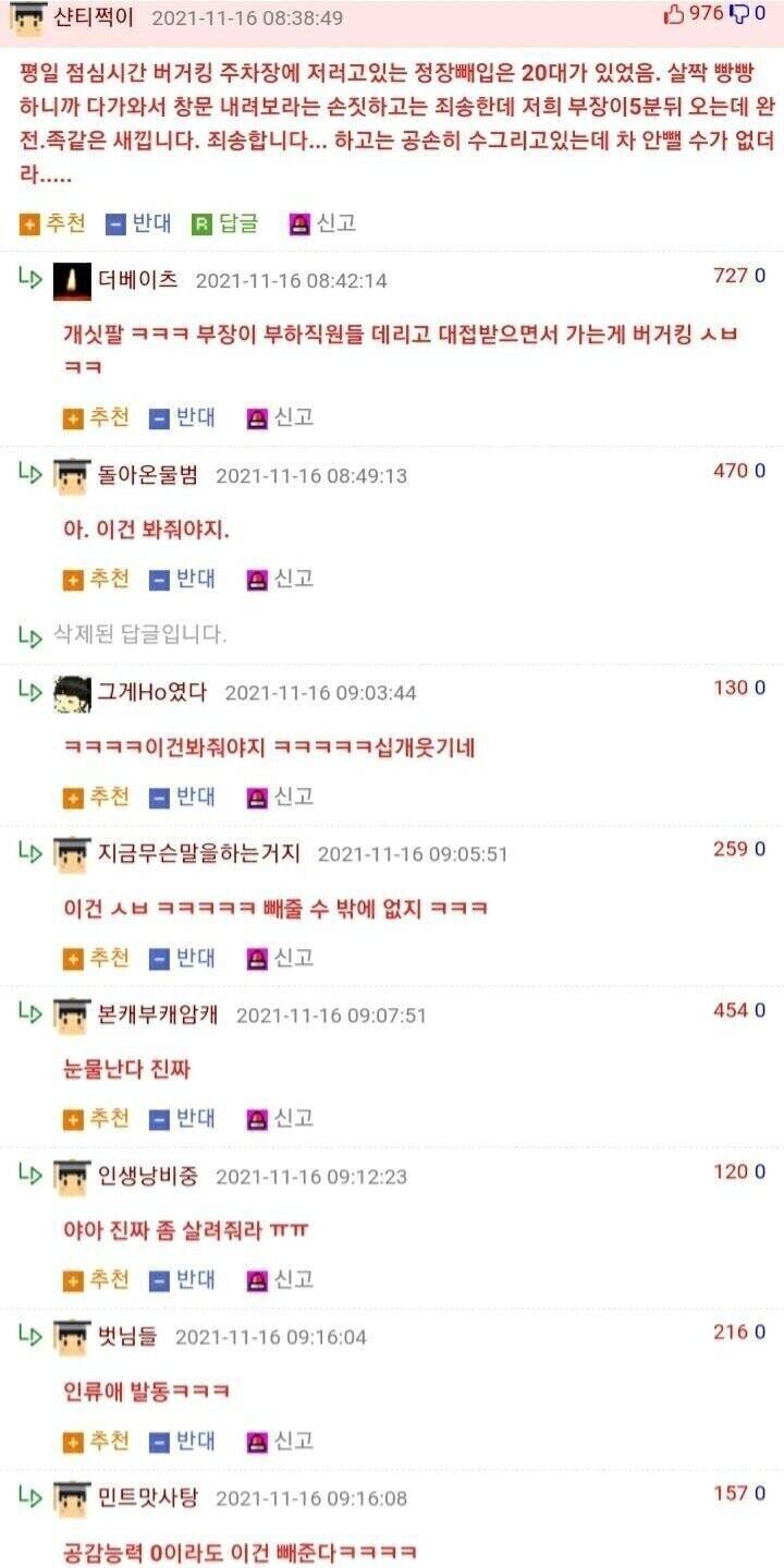 주차장 자리 맡는 사람, 욕 할 수 없던 이유 feat. x같은 직장생활 버거킹 주차장에서 몸으로 자리를 맡던 사람 사연 주차장에서 차 없이 몸으로 자리를 맡고 있는 건 진짜 꼴불견 이지만 저건 저 사람을 어떻게 욕하냐, 직장이 x 같은 거고, 그런걸 시키는 인간이 쓰레기 인거지... 하아... 공유하기 게시글 관리 킁킁닷넷 종이컵 제작 인쇄 전자담배액상 가시눈뉴스 애니리뷰 & 게임공략략 SEO최적화 벤츠튜닝 Related Articles 대국남아 가람, 동석 AV배우는 누구? 소이현 빵, 과자 잘 안 먹는 이유 베이글 배소빈 기상캐스터 사진 15장 바바라팔빈 몸매 레전드짤