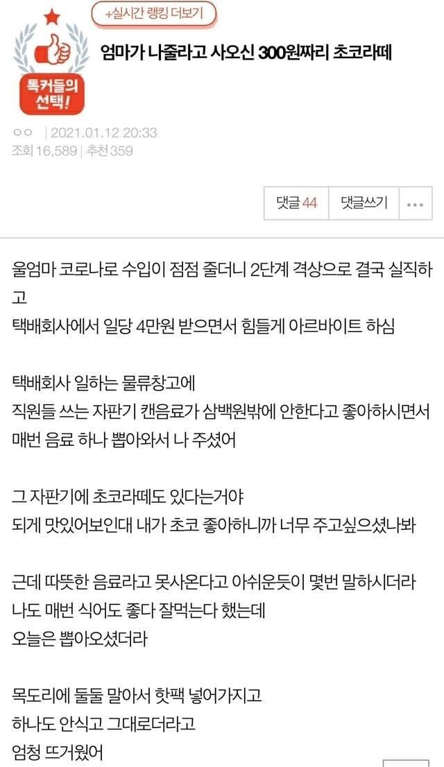 눈물나는 엄마의 300원짜리 초코라떼 자식 생각하는 엄마의 사랑이 담긴 초코라떼 실직이든 어떤 상황이든 자식 생각이 먼저인 어머니가 가져오신 300원짜리 초코라떼... ㅜㅠ 진짜 눈물난다... 어머니 건강하세요 공유하기 게시글 관리 킁킁닷넷 전자담배액상 비트코인 가시눈뉴스 애니리뷰 & 게임공략략 SEO최적화 벤츠튜닝 Related Articles 비둘기가 ㅅㅅ 하면 죽는 이유 저기 멀리간 김밥 할머니 얘기에.. 내향적 사람, 모르는 번호로 전화 왔을 때 낚시 vs 게임, 남편취미에 대한 아내의 판단