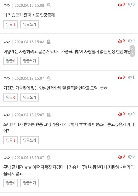 가슴 큰 고민 글에, 작은 가슴 판녀들의 분노 작은 가슴 판녀들, 가슴 큰 고민에 분노 네이트 판에 가슴이 커서 고민이라는글이 올라오고, 인증 사진이 올라옴그리고 달리는 가슴 작은 판녀들의분노에 찬 댓글들 공유하기 게시글 관리 킁킁닷넷 저작자표시 (새창열림) 에임 종이컵 제작 인쇄 전자담배액상 비트코인 가시눈뉴스 애니리뷰 & 게임공략략 SEO최적화 벤츠튜닝 Related Articles 귀멸의칼날 what if 만약 형님이 참을 수 있었다면 개발자 유머 모음 18개 가족오락관 전설의 방송사고 망가 주요 작가별 그림체 및 장르