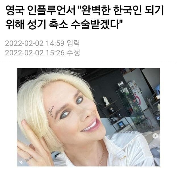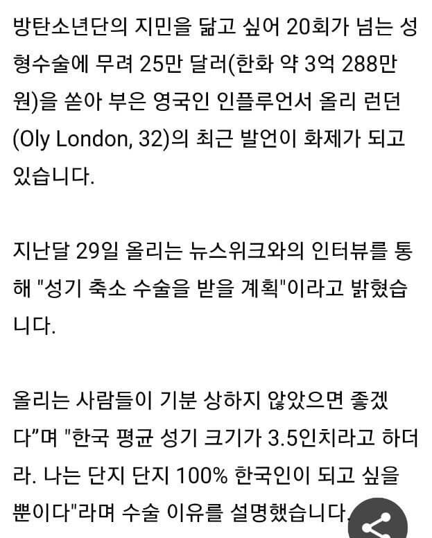 한국인 닮기 위해 영국 인플루언서가 한 수술이.... 한국인 닮기 위해 성기 축소 수술을 했다고????? 한국인 특히 방탄 지민 닮기위해 3억 넘게 성형수술한 영국 인플루언서 올리런던이 더 완벽한 한국인이 되기위해 성기축소 수술을 계획하고 있다고.... 흐음... 방탄 지민 닮기위해서라며, 지민은 어떤지도 모르면서!!! 왜 축소 수술을 받으려고 그러냐고!!!!!! 공유하기 게시글 관리 킁킁닷넷 종이컵 제작 인쇄 전자담배액상 가시눈뉴스 애니리뷰 & 게임공략략 SEO최적화 벤츠튜닝 Related Articles 와이드팬츠 단점. 바람이 불면... 우주에서는 성관계 못 하는 이유 임시완 신동엽 선물한 꿈의 술. 가격도 천만원대 인데.. 서울의봄 대만판 포스터. 근데 이거 중국 애들이...