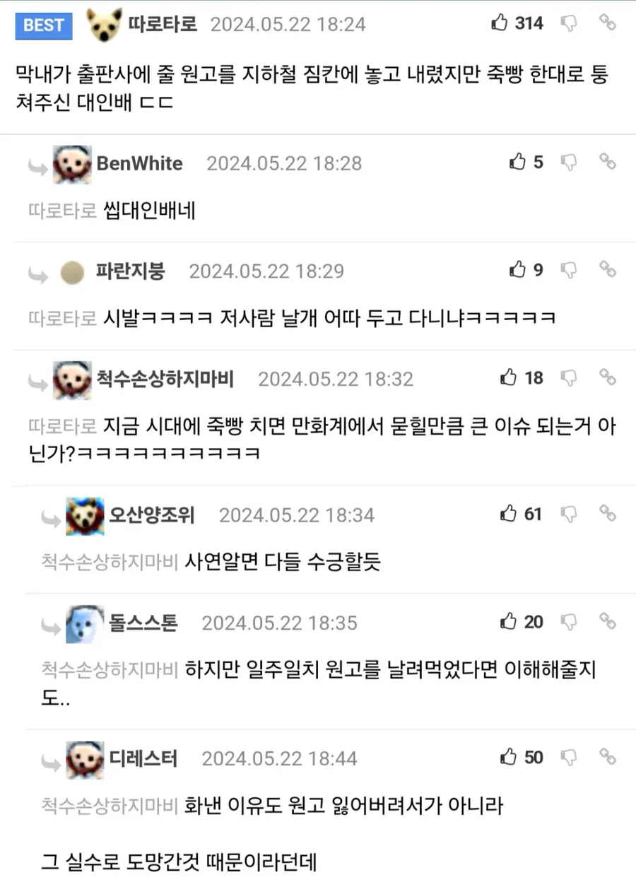 김성모 원고 잃어버린 직원 때린 이유가?! 김성모 지하철에 원고 놓고 내린 직원 죽빵 때려 김성모 화실 막내가 출판사 건내 줄 원고를 지하철에 놓고 내렸는데 그걸 죽빵 한대로 끝내서 대인배라고 칭송 받았는데, 사실 그것도 지하철에서 놓고 내려서 때려서 때린게 아니라 잃어버려놓고 도망가서 그런거라고.. 근데 진짜 잃어버리고 도망간건 진짜.. 공유하기 게시글 관리 킁킁닷넷 전자담배액상 비트코인 가시눈뉴스 애니리뷰 & 게임공략략 SEO최적화 벤츠튜닝 Related Articles 일본 전봇대 관리법. 오타쿠 잘 이용하는 일본 코믹월드 마케팅 욕먹는 이유 현대미술 하는 주갤러. 주식말고 다 잘 하네.. 방글라데시 여행 유튜버, 현지 여자에게 사랑받아 화제