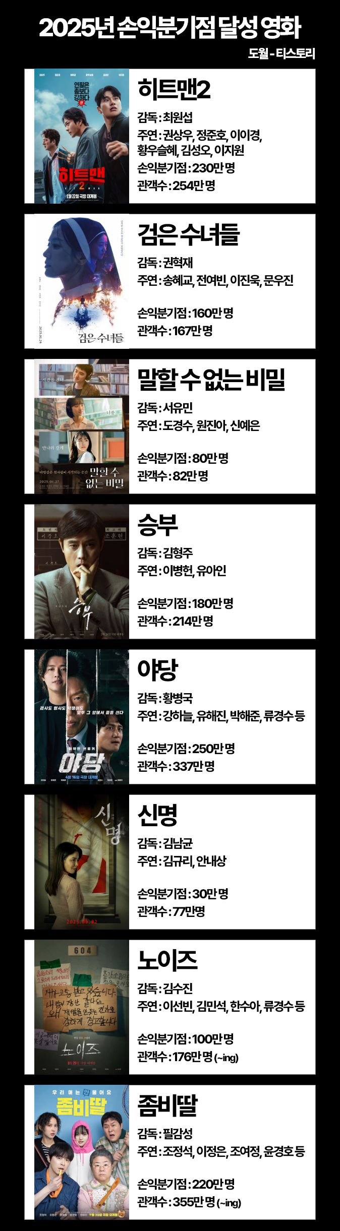2025 수익난 한국영화. 손익분기점 남긴 한국영화 손익분기점 달성 한국영화 2025 25년 개봉한 영화 중 손익분기점을 넘겨서 수익을 달성한 한국 영화들 목록 개봉일 순으로, 현재까지 최고는 좀비딸 (수익률은 신명), 가장 아슬아슬 했던 것은 말할수없는비밀과 검은수녀들 개인적으로 의외는 노이즈. 히트맨2는 어쨌든 후속작이 나올정도니까 수익은 나오려나 싶었다면 노이즈는 솔직히 이름도 처음 들어서... 공유하기 게시글 관리 킁킁닷넷 종이컵 제작 인쇄 전자담배액상 가시눈뉴스 애니리뷰 & 게임공략략 SEO최적화 벤츠튜닝 Related Articles 컴포즈 여사장, 아저씨 때문에 눈물 흘린 이유 위고비 부작용 사용후기 농협 121억 불법 대출 방법, 대출심사 안 걸리고 이게 가능해?? 흑백요리사 급식대가 실력 체험. 구내식당 후기